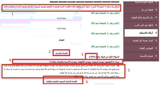 Data collected from “Dar Al Ifta in Saudi Arabia” website. 1. Main title (the meaning of oneness of lordship, worship, names, attributes and self), 2. subtitle (types of oneness), 3. fatwa number, 4. fatwa question (what is the meaning of oneness of lordship, worship, names, attributes and self?), 5. fatwa answer (oneness of lordship: is oneness of Allah (God) through His actions of creation, provision, life, death, and so on. Oneness of worship is the worship of Allah alone in prayer, fasting, Hajj, zakat, vows, sacrifice, and so on. Oneness of names, attributes: is describing Allah the way He has described Himself, and the way His Messenger (peace be upon him) described Him; and naming Him with the Names that He has named Himself with, and His Messenger (peace be upon him) named Him with, without comparison, likening Allah’s Attributes to those of His Creation, allegorical interpretation nor denial of Allah’s Attributes), 6. mufti name.