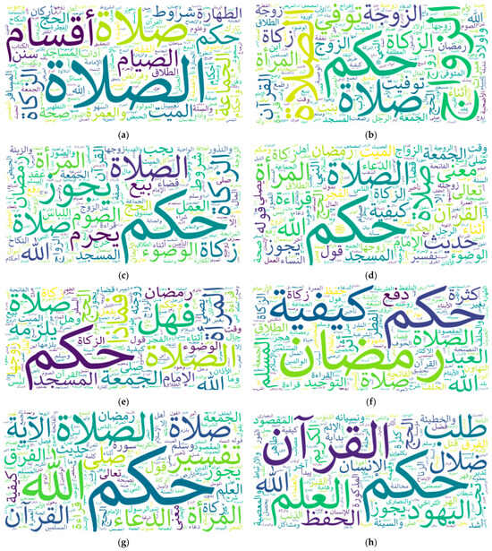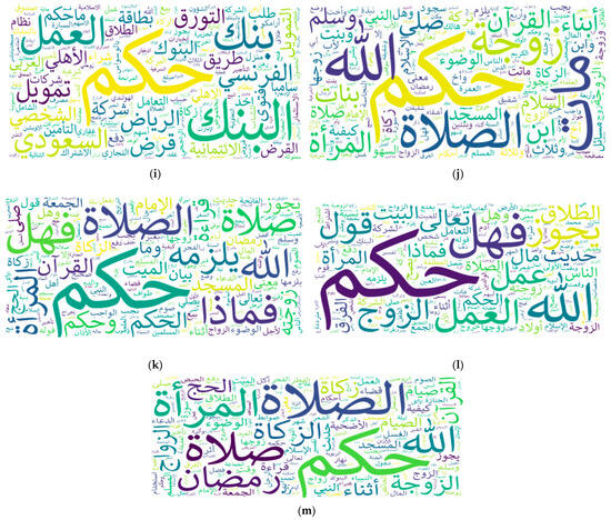 Results of topic modeling: (a) Dar Al Ifta in Saudi Arabia; (b) Dar Al Ifta in Egypt; (c) Dar Al Ifta in Jordan; (d) Al Shaikh Abdual Aziz Ibn Baz; (e) Al Shaikh Mohammad Ibn Othaimin; (f) Al Shaikh Abdual Aziz Al Ashaikh; (g) Al Shaikh Saleh Al Fwzan; (h) Al Shaikh Saleh Bin Humaid; (i) Al Shaikh Abdullah Al Manee; (j) IslamWeb; (k) FatwaPedia; (l) IslamQA; (m) IslamOnline.