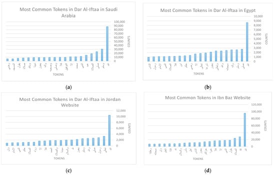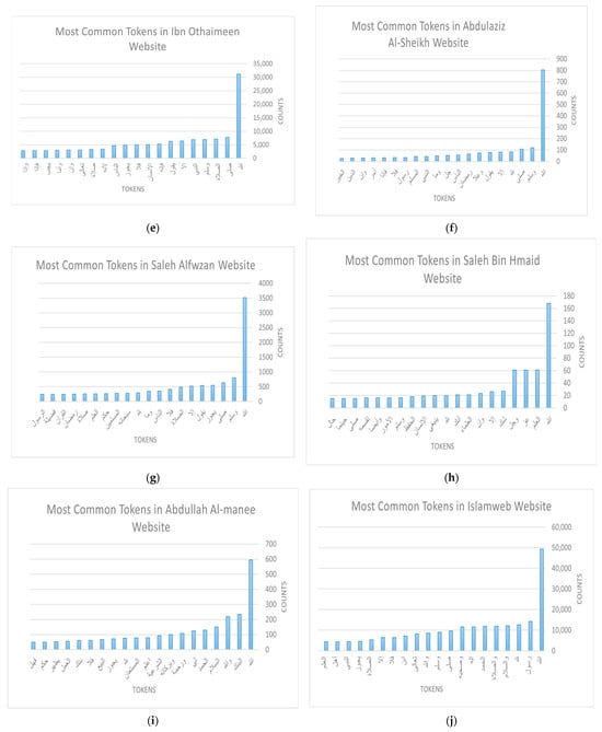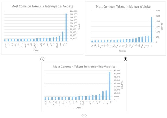 The other important dimension of this Exploratory Data Analysis (EDA) focuses on the fatwa itself by considering the text body of the fatwa (question and answer). Here, we took each website separately and generated a list of their most frequent words, along with the number of occurrences for each token. Figure 3a–m illustrate the top 20 frequent words regarding fatwas for each website. The words are translated in Appendix A (Table A1) in the order they appear in the figure.