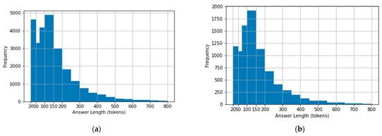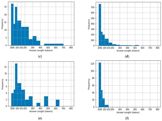 Because the dataset contains fatwas from certain religious scholars’ websites, we wanted to examine the way each one of them answers fatwas. Specifically, we plotted histograms that show the number of tokens (words) a scholar used when answering questions. This provides information about the details each scholar gives when responding to fatwas. Also, this may give indications about the complexity of the questions and the personality of each scholar. This step is considered the first step in a research field called stylometry, which is a statistical analysis that studies the linguistic features of a text [19]. We analyzed the answers of all the scholars in the dataset (Al Shaikh Abdual Aziz Ibn Baz, Al Shaikh Mohammad Ibn Othaimin, Al Shaikh Abdual Aziz Al Ashaikh, Al Shaikh Saleh Al Fwzan, Al Shaikh Saleh Bin Humaid, and Al Shaikh Abdullah Al Manee). Figure 4a–f illustrate the histograms of the scholars’ answers. The histograms represent the differences in the number of used tokens among the scholars by plotting the frequency of each answer length (in terms of tokens). In general, none of them exceeded 700 words in their answers except Al Shaikh Abdual Aziz Ibn Baz and Al Shaikh Mohammad Ibn Othaimin, who reached 800 words in some of their answers. Al Shaikh Abdullah Al Manee is a special case as he did not exceed 150 words. Regarding the frequency, it is noticeable that Al Shaikh Mohammad Ibn Othaimin and Al Shaikh Saleh Bin Humaid usually gave the longest answers compared with others in the dataset. This is because they frequently answered using, on average, a range of 70-150 words. On the other hand, Al Shaikh Saleh Al Fwzan and Al Shaikh Abdullah Al Mane frequently gave short answers, as their answers are usually in the range of 20–50 words.