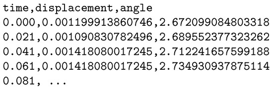 where t represents the time in milliseconds, d represents the displacement since the previous sample (in meters), and defines the absolute angle at which the wheel is positioned at (value between 0 and , in radians). An example of the encoder data from a CSV file is provided in Figure 1.
