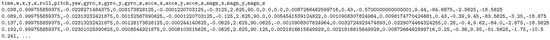 where t represents the time in milliseconds, represent the orientation in quaternion format, represent the orientation in Euler angles (degrees), and , , and tri-axis values represent the raw data from the gyroscope, accelerometer, and magnetometer sensors, which measure the angular rate (rad/s), acceleration (m/s2) and magnetic field (μT), respectively. An example of the IMU data from a CSV file is provided in Figure 2.