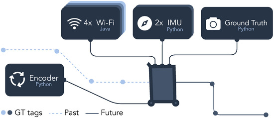 The main architecture of the data collection system, depicted in Figure 6, represents each module and the software technology used to collect data from each sensor. Data from the Wi-Fi interfaces are obtained from a multi-threaded Java application that saves data from each interface into a separate Comma-Separated Values (CSV) file. Similarly, data from the IMUs are obtained from a Python application, running separately for each IMU sensor. This application is also multi-threaded to avoid blocking when it is writing to the files. Data from IMUs are exported into separate CSV files. Data from the encoder sensor are obtained from a Python application and exported into a CSV file. Ground truth data are obtained from a video that records the gt! tags, placed on the floor, when the mobile unit moves. A Python application processes the video to obtain the true position and heading of the mobile using, which are exported into a CSV file.