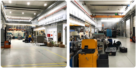 The data collection took place at the PIEP building, which is part of the University of Minho’s Azurém Campus. PIEP (Figure 7) is a Centre for Innovation in Polymer Engineering; hence, it has an open-space area quite similar to a factory plant with plastic extrusion machines. The building measures 20 m by 50 m and has a Wi-Fi infrastructure with several APs installed inside. All APs are emitting in the 2.4 GHz frequency band. Figure 8 shows the floor plan, the positions of APs and their IDs as well as the reference points where Wi-Fi samples were collected to build the radio map. These reference points also mark the locations where GT data were collected. Grey areas in the floor plan represent obstacles or non-navigable areas.