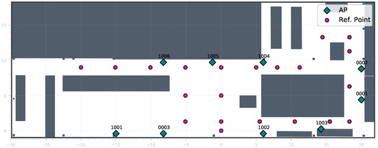 Table 1 includes details about the deployed APs, namely, their ID, brand and model, and the transmission channel of each AP in the 2.4 GHz frequency band. These APs are the ones whose positions are known. Despite that, there are also other APs available in the building whose positions are not known.