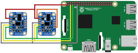 We opted for low-cost sensors to evaluate their feasibility in real-world applications; therefore, we decided to include two IMU sensors in the mobile unit. We selected the Adafruit BNO055 IMU; since it has several fusion modes and provides the absolute position, it can be easily connected to the RPi, it is low-cost, and it is simple to work with. The IMU’s RPi connection setup is shown in Figure 10. In order to connect two BNO055 sensors to the same RPi device, it is necessary to change the default I2C address in one of the IMUs. One device has the default I2C address, which is 0x28. And the device where the ADR pin is connected to 3.3 V has a default I2C address of 0x29.