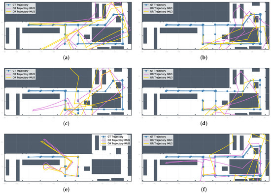 Estimated trajectories using dead reckoning: (a) T1, (b) T2, (c) T3, (d) T4, (e) T5, (f) T6. GT trajectory represents the ground-truth trajectory; DR Trajectory IMU1 and DR Trajectory IMU2, represented by the purple and yellow plot lines, define the dead reckoning trajectories obtained with IMU1 and IMU2, respectively.