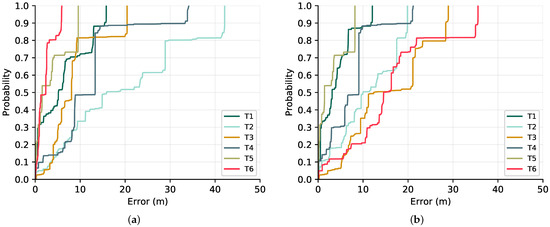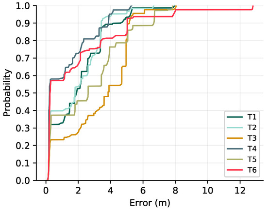 Figure 14 illustrates the CDF of these results, presenting the error distribution for each trajectory. Notably, trajectories T4 and T6 exhibit comparable performance up to the 75th percentile, achieving positioning errors of 2.14 m and 2.86 m, respectively. However, it is worth mentioning that despite having the second-best 75th percentile error, T6 demonstrates the highest positioning error, measuring 12.80 m. Although the maximum error of T6 is higher than the one observed in the other trajectories, it is a rare occurrence. This is evident from the fact that its 95th percentile positioning error is 7.89 m, which is similar to the maximum error seen in the other trajectories. Consequently, 95% of the evaluated position estimates lie below 7.89 m, thus being a more reliable indication of typical performance.