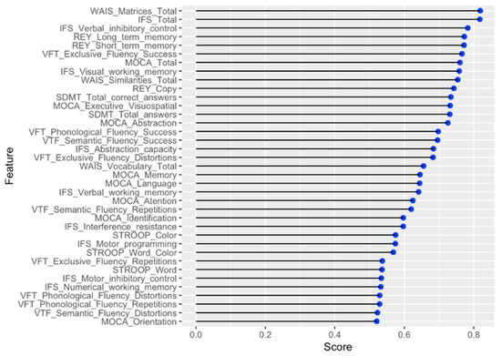 Filter methods select features based on their scores in various statistical tests to determine their correlation with the outcome variable. One of the main advantages of the filter method is that it is independent of any machine learning algorithm. In this case, we used the filterVarImp function in R (from the Caret library), which uses ROC curve analysis on each predictor and area under the curve as scores. This function can be used to evaluate features without the need for a specific model. The selection of features is independent of any machine learning algorithms. The score for each feature is shown in Figure 4.