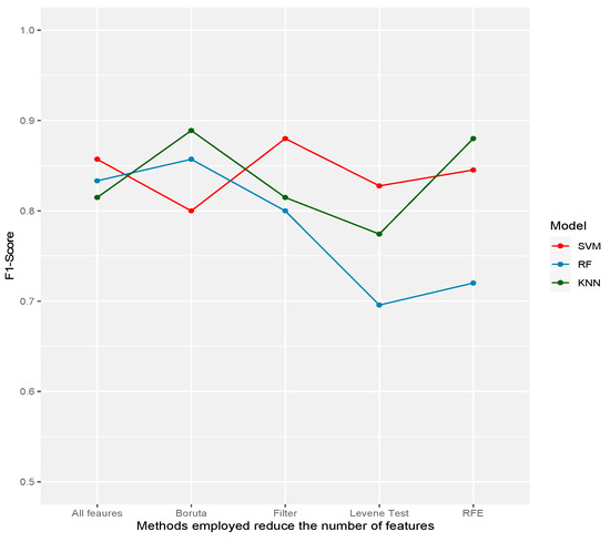 The best result was achieved by the K-NN model trained with the 19 features selected by the Boruta method, followed by the K-NN model trained with the 14 features selected by the RFE method, and, thirdly, by the SVM model trained with the 24 features selected by the filter method.