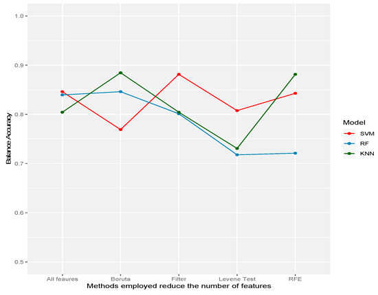 The best results were achieved with the K-NN model trained with features selected by the Boruta method (balance accuracy = 0.8846) followed by the K-NN model trained with features selected by the RFE method (balance accuracy = 0.8814) and the SVM model trained with features selected by the filter method (balance accuracy = 0.8814). Other comparison metrics are shown in Table 3 (sensitivity/recall, specificity, and F1-score).