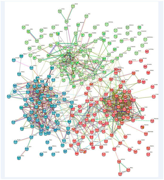 Next, gene ontology (GO) categorization [37,38,39] was performed using the Enrichr platform [40] (https://maayanlab.cloud/Enrichr/, accessed on 18 July 2023) on the 271 GALC-modulated proteins (172 up-regulated plus 99 down-regulated) characterized by a fold change greater than 1.5 or lower than 0.67. The analysis identified the terms “RNA binding” (p value = 2.01 × 10−12) and “intracellular organelle/secretory granule lumen” (p value = 1.17 × 10−12) as the most enriched GO molecular function and GO cellular component terms, respectively, whereas “tricarboxylic acid cycle” represented a highly enriched Kyoto Encyclopedia of Genes and Genomes (KEGG) pathway [41] (p value = 2.59 × 10−4). Accordingly, string analysis of the differentially expressed proteins identified three major clusters (protein–protein interaction enrichment p value ≤ 1.0 × 10−16) corresponding to the GO terms “RNA binding” (FDR = 4.11 × 10−8), “extracellular exosomes” (FDR = 6.77 × 10−21), and “oxidation–reduction process” (FDR = 2.79 × 10−15) (Figure 1).