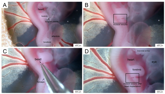 Figure 1. The images display the method of in ovo bead implantation for local drug testing during embryonic wound healing. (A) shows the anatomy of the chicken embryo in ovo and how the incision wound is made using a tungsten needle. (B) shows the incision wound. (C) demonstrates the bead implantation using forceps. (D) displays the final stage after the surgical procedure. A total of 2–3 beads are placed in the incision wound. - Use fine forceps to collect several beads from the solution in the microcentrifuge cap. Place the beads near the wound area and push several beads into the wound (Figure 1C,D).