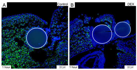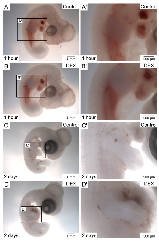 The macroscopic images (Figure 2) show successful bead implantation after 1 h and 2 days, respectively. Note that the beads in the dex wound after 1 h (Figure 2B′) appear more superficial, indicating a prolonged or impaired regeneration process. After 2 days of further incubation, the beads were absorbed by the embryonic tissue even more, and differences between the control and dex group became difficult to discern macroscopically (Figure 2C,D′), requiring deeper analysis using further methods.