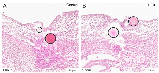 To gain more insights into the process of regeneration of bead-implanted embryonic wounds, transverse HE-stained sections of the respective areas can be compared. This enables visualization of the embryonic wound in its whole depth on a cellular level. The standard HE staining displayed that the dex-treated wound exhibited a larger epithelial defect after 1 h (Figure 3), with erythrocytes covering the open skin wound, but fewer erythrocytes in the granulation tissue in comparison to the control wound.