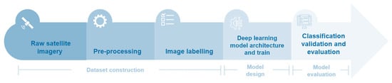 The general methodology employed in this study consists of five stages, encompassing the collection of raw satellite images, which are preprocessed and labeled in the following two phases. Subsequently, a DL model was designed and trained in the subsequent stage, and the performance was evaluated using a set of carefully selected metrics, considering the task of semantic segmentation and accounting for the high levels of class imbalance present in the data (see Figure 1).
