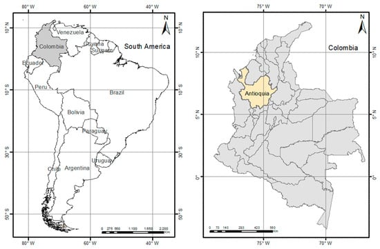 The Department of Antioquia in Colombia is in the northwest region of the country. Its geographic coordinates span from approximately 5.4° N to 8.8° N latitude and 73.8° W to 77.5° W longitude (see Figure 2). It spans an area of approximately 63.612 km2. It is bordered by several neighboring departments, including Cordoba and Bolivar to the north, Santander and Boyacá to the east, Caldas y Risaralda to the south, and Chocó to the west. The Antioquia department has a significant administrative division within the country, comprising 125 municipalities and serving as a relevant economic and cultural hub in Colombia.