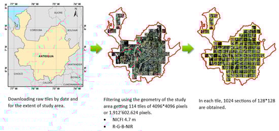 A Python script was written in conjunction with the Planet Scope API to access tiles based on the data and boundary box of the Antioquia department in Colombia. This resulted in an acquisition of approximately 392 tiles. These tiles correspond to composite images taken in the first half of 2019, with the specific product being ‘planet_medres_normalized_analytic_2018-12_2019-05_mosaic’. This product was chosen since its dates align well with available land cover maps, which were used to construct the image labels. After filtering the tiles using the study area’s geometry, a final set of 114 tiles was identified. These tiles are entirely encapsulated within the predetermined study area, with each tile measuring 4096 × 4096 pixels.