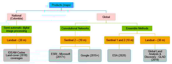 Analysis of Remote Sensing, National and Global Coverage Data Sources. Map extent (pink), methodology used in the construction of the maps (green), type of images (orange), and responsible organization (grey).