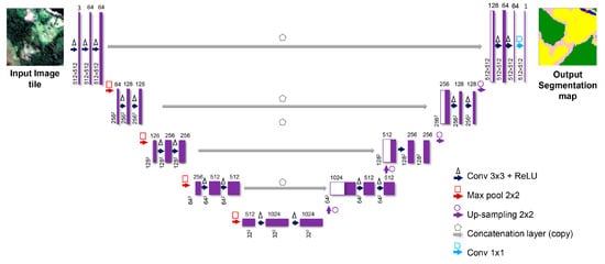 Furthermore, the efficacy of U-Net for the task of satellite image segmentation has promoted its investigation. In [] introduced an integrated framework that combines enhanced versions of the U-Net and SegNet models to enhance the accuracy and performance of high-resolution image segmentation. Enhanced versions of U-Net have been utilized to analyze the spatial distribution of palm canopy and its relationship with human disturbance and soil conditions []; they have also been employed for the assessment of mining activities, a primary cause of deforestation, land use change, and pollution [], as well as for mapping the inundation status of forested wetlands by integrating spectral bands, topographic data, and lidar information [].