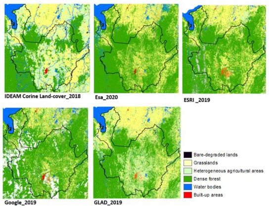 In general, a greater overestimation in forest cover is observed for the ESA, ESRI, and Google maps. A possible reason for this is the technical challenge of separating the woody and herbaceous components [], although a more rigorous evaluation is required. There are several studies that highlight the difficulties of individually applying global coverage maps at the regional level [,].