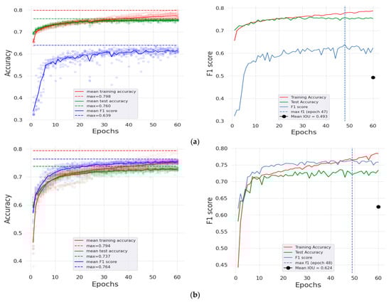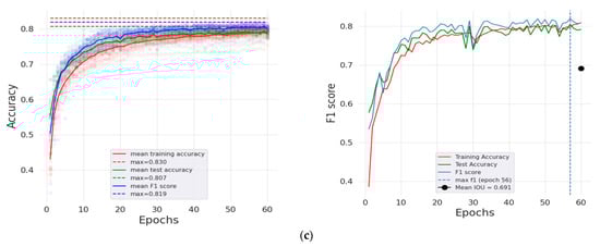 Preprocessing procedures were executed on the data prior to the training phase. The data were standardized through a process of subtracting the mean value of each band and dividing it by its corresponding standard deviation. This could help to address possible instabilities in training arising from the different input data scale and the difference in lighting conditions and could make the model less sensitive to outliers compared to min–max scaling []. Furthermore, we employed Keras he_normal initializer without incorporating a specific seed value. Consequently, there are pragmatic discrepancies in the weight initialization process for all the models.