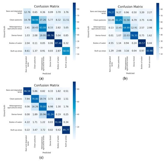 The plethora of sensors available and their variations in spectral and spatial characteristics present an opportunity for mapping, quantifying, and detecting changes through DL methods. Recent studies encompass the analysis of various sensors [,] and spectral bands, finding the NIR and SWIR bands to be of greater significance in land cover classification. Conversely, the blue band was identified as the least significant variable. In [,], DL was employed for optical and fused classification using synthetic aperture radar (SAR) imagery; these studies demonstrated that when using combined data, the accuracy surpasses that of individual datasets. In [], the potential in the joint analysis of multiple sensors for delineating forest cover across various ecosystems located in Germany was highlighted.