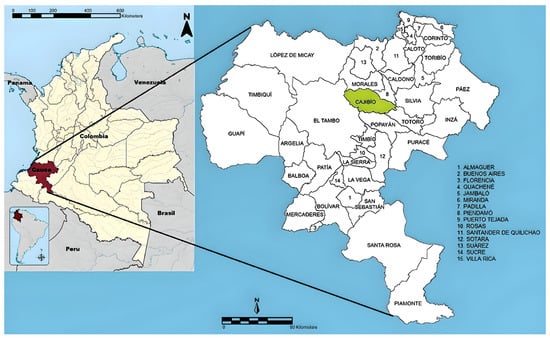 Figure 1. The left side highlights the Department of Cauca in red, while the right side showcases the location of Cajibio, indicated in green. The list of numbers on the image indicates the name in Spanish of each township located graphically within the department of Cauca, Colombia.
