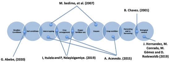 The detection process focused on identifying qualitative information related to productive activities and coffee bio-aggressors, intending to define the variables to be considered in the dataset. As the primary process, exhaustive bibliographic reviews of scientific documents between the years 1990 and 2022 were carried out, establishing inclusion criteria for the scientific articles and exclusion criteria for non-formal documents. Initially, 40 research studies were obtained; however, under the exclusion criteria, 27 papers were selected that directly related to productive tasks with bio-aggressors in coffee. The analysis of the results of the most representative scientific articles on bio-aggressors in coffee due to productive activities are summarized in Figure 3 below.