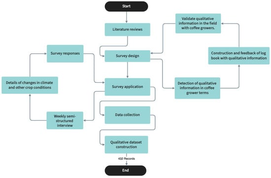 The survey design began with activities such as filling out a logbook, which allowed the terms that coffee growers use about their crops to be stored. Filling out the log allowed us to establish a more user-friendly knowledge base with exploratory purposes to acquire a greater knowledge about coffee cultivation and identify how they visualized the different variables established from the bibliographic analysis. Different activities that coffee growers carried out periodically in their crops were identified. This valuable information was filled out in the record book, allowing it to be one of the main inputs to establish and design the semi-structured surveys with the support of the research group for rural development TULL [], framing the components or variables of the climatic conditions, the productive tasks, external crop conditions, and bio-aggressors of coffee cultivation in Cauca.