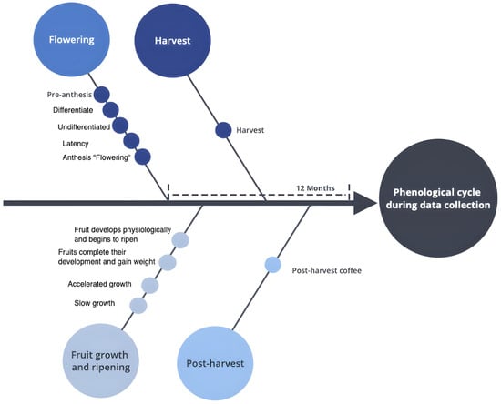 Regarding the survey application with the process of applying the semi-formal interviews, it was decided to conduct them weekly in order to monitor the productive work carried out continuously, the weather conditions on the crop, and the validation of other external variables. Mainly, the interviews were based on monitoring events such as weather conditions, and the respective productive work carried out that week. The main objective was to continuously survey possible climatic changes associated with other variables that would allow important information to be saved regarding coffee bio-aggressors. Each coffee farmer’s interview enriched the dataset with all the information provided. The semi-formal interview process took into account a complete coffee phenological cycle of the Cauca coffee crop, as shown in Figure 5.