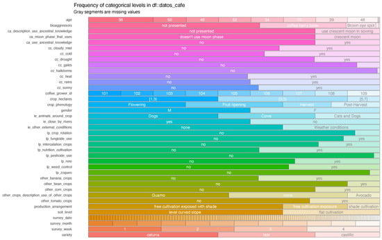The information recollected through the survey format was transformed into plain text separated by comma values (CSV file). The dataset comprises qualitative/numeric variables such as climatic conditions, the productive activities of the coffee crops, ancestral knowledge, and other external conditions found in the crops (Table 3).