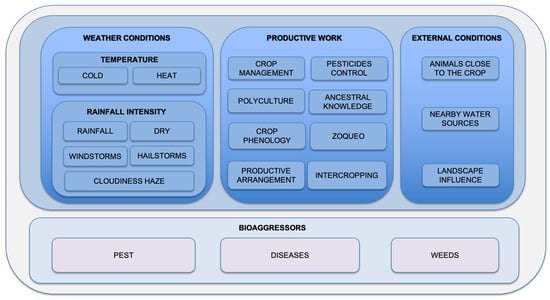The dataset comprises 432 records and 41 variables. Temperature and rainfall intensity are associated variables with weather conditions. Crop management, biopesticide control, polyculture, ancestral knowledge, crop phenology, Zoca, productive arrangement, and intercropping variables are related to productive activities. Variables like animals close to the crop, landscape influence, and water sources reflect external conditions. Lastly, the pests, diseases, and weeds variables compose bio-aggressors.