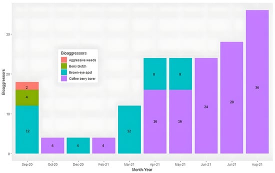 Figure 9 illustrates the occurrence of bio-aggressors by month. Notably, no bio-aggressors were observed in November 2020 and January 2021. However, in September and December 2020, there were 28 recorded cases of brown-eye spots. This affliction was also observed from March to May 2021. Conversely, the CBB appeared incrementally from April to August 2021. The most significant concurrent bio-aggressor occurrence transpired in September, encompassing three bio-aggressors: brown-eye spot, berry blotch, and aggressive weeds.