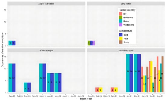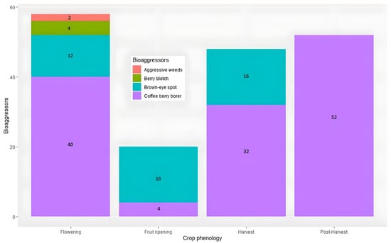 The brown-eye spot is reported during the flowering, fruit ripening, and harvest stages. Moreover, the presence of aggressive weeds is more frequent during the flowering stage of the crop. On the other hand, CBB occurs in all four stages (flowering, fruit ripening, harvest, and post-harvest). However, the most significant number of incidences are detailed in the post-harvest stage and are correlated with the fall of coffee plants to the ground, which, together with climatic conditions such as drought or heat, trigger CBB.