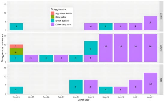 Finally, the farms most influenced by bio-aggressors were 1, 2, 4, 5, 7, and 8. In contrast, farm 3 presented fewer bio-aggressors (four cases of CBB), while the coffee growers applied weed control and collection review to reduce the pest.