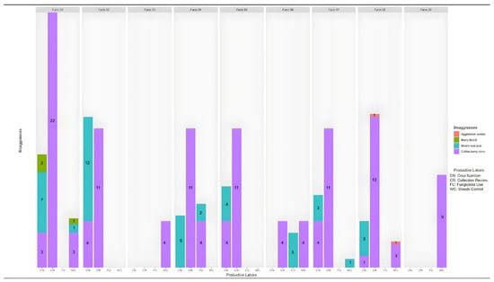 The chart shown in Figure 13 displays the bio-aggressors discovered during the farming operations of each farm. It was observed that, in farms 5, 7, and 8, outbreaks of CBB happened concurrently with the activities of “harvesting and reworking”. The presence of the bio-aggressor during the post-harvest phenology stage (as seen in Figure 12) suggests that this caused the outbreak. To address this issue, harvesting, and reworking were deemed necessary to control the CBB.