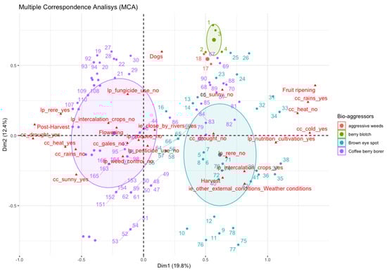 The MCA plane in Figure 14 shows the proximity relationship between the bio-aggressor known as brown eye spot and several nearby factors, including cold conditions, rain, absence of heat, and presence of clouds. The presence of this bio-aggressor occurs under humid conditions. Additionally, it can be analyzed that it occurs during the fruit ripening stage. Furthermore, it is observed that the coffee grower regularly performs crop nutrition under those humid conditions to counteract the nutritional imbalance that humidity could cause and avoid making the plants more susceptible to the disease. For this reason, nutrition is applied to the crop to generate plant resistance to damage from cold or humidity and brown eye spots. As for the appearance of the CBB, according to the map analysis (Figure 14), it is related to the incidence of drought, heat, or sunny environments, especially in flowering and post-harvest stages. Moreover, CBB occurrence is related to productive labor such as collecting and reviewing (in Spanish(Recolecta y Recolección—ReRe)), inferring that there is a relationship between that productive work in the post-harvesting stage because that labor helps to reduce the birth and propagation of CBB.