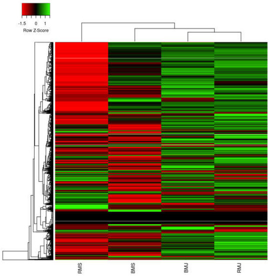 A total of four RNA libraries (BMJ, BMS, RMJ, and RMS) were prepared and sequenced. The RNA-seq was performed using MinION ONT (oxford nanopore technologies). The transcriptome sequencing had an estimated number of reads of 634,035, 697,857, 633,288, and 144.667 for the BMJ, BMS, RMJ, and RMS conditions, respectively. The preprocessed analysis using phychopper [11] and cutadapt [12] showed approximately 72–82% high-quality reads. The de novo assembly was constructed using the RATTLE program and produced 10,248 transcripts. The results of the sequencing and pre-processing are summarized in Table 1. The open reading frames (ORFs) from the transcripts were determined using the TransDecoder program, and this produced 4053 Transcripts with 27.88% of them being 5′prime_partial, 3.73% of them being 3′prime_partial, 1.51% of them being Internal, and 66.89% of them being incomplete. The summary of the de novo transcriptome assembly and open reading frames (ORFs) prediction characteristics is in Table 2. The gene abundance estimation was calculated using TPM, and it is presented in Figure 1. Figure 1 shows the differences in the abundance of genes affected by the LED and MeJA-MeSA hormones.