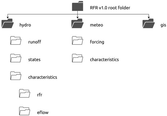 The RFR v1.0 dataset [13] is distributed as a single compressed archive in a “tar.gz” format. After extraction ($ tar-xf RFR_v1.0.tar.gz), the dataset represents a standard structure of nested folders with machine-readable files (in “.csv” and “.geojson” formats). The dataset can be divided into three parts (Figure 2): the main part consists of hydrological (folder hydro) data and the two auxiliary parts include meteorological (folder meteo) data with the related geospatial information (folder gis).