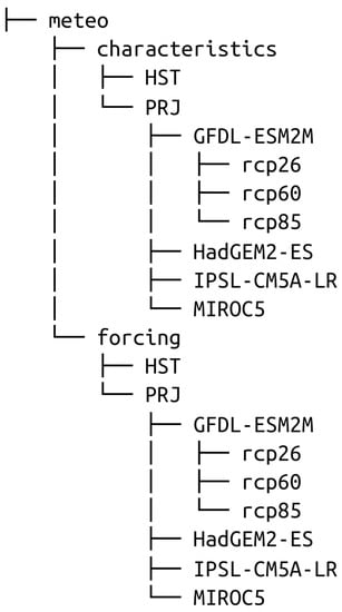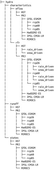 The organizational structure of meteorological data is similar to the hydrological data (Figure 4). There are two nested parts—meteorological forcing data (folder forcing) and characteristics (folder characteristics). Both of these parts include subfolders for historical (HST folder, 1979–2016) and projected (PRJ folder, 2017–2099) periods, respectively. In turn, projected period data include subfolders for the respective GCMs and RCPs. For consistency with the hydrological part, meteorological characteristics have also been computed for the hydrological year (1 November–31 October).