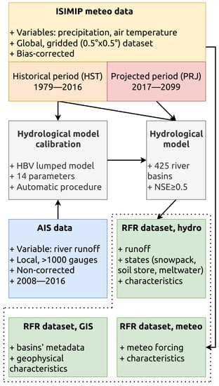 In the next step, for each of 425 selected river basins, runoff predictions, as well as hydrological models states—soil reservoir dynamics, snow water equivalent, and amount of melted water—are calculated by using historical and projected meteorological data as forcing (Section 2.1.1).