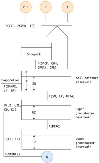 A hydrological model is a core component of the presented workflow (Figure 5). Here, we use the HBV (in Swedish, Hydrologiska Byråns Vattenbalansavdelning) hydrological model [30,31]. HBV is a lumped conceptual hydrological model that represents river runoff formation mechanism at the basin scale using the system of connected storage reservoirs (Figure 6). The model has 14 free parameters to fit a wide range of natural conditions (Table 1). The required input data is a daily time series of air temperature (T, °C), precipitation (P, mm), and potential evaporation (PET, mm). All variables are computed by spatial averaging based on the relative weights of the intersection between basin boundaries and corresponding grid cells of the ISIMIP meteorological data (Section 3.1). Potential evaporation (PE, mm) is calculated using the temperature-based equation proposed in [32].