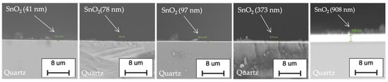 SEM images show cross-section images of SnO2 films of six different thicknesses (i.e., 41 nm, 78 nm, 97 nm, 373 nm, and 908 nm.