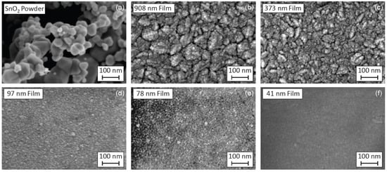 These SEM images show SnO2 films of six different thicknesses or forms at similar magnifications: (a) powder, (b) 908 nm thick, (c) 373 nm thick, (d) 97 nm thick, (e) 78 nm thick, and (f) 41 nm thick. Relevant measurement parameters can be found in the Methods section.