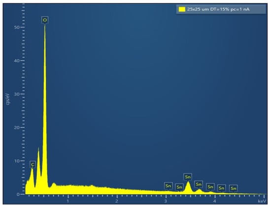 Scanning electron microscopy was used to gain an initial understanding on how the powder and film SnO2 samples appeared in terms of grain sizes and uniformity. As such, these resulting images, shown in Figure 1 and whose parameter data are provided in the Methods section, show that the superficial layers within thicker samples (notably the 908 nm and 373 nm) are not as uniform. Such an appearance may result by way of thermal cracking or by spontaneous seeding (the samples were not annealed during the SEM process, only during manufacturing). This interpretation can be supported by the behavior where, at 373 nm, smaller clusters appear to form than in the case of the 908 nm film (Figure 2). The SEM images also reveal that, for the films thinner than 373 nm, the superficial surface layers appear more uniform. Given that the same measurement parameters were used for all samples, it appears that the 41 nm has the least disordered appearance from all of the films. As far as the powder samples are concerned, their clusters appear more unbounded, with almost a near-spherical smoothness, at least within the 100 nm measurement scale used for all images. Energy Dispersive Spectroscopy (EDS) analysis was carried out on the 908 nm thick sample to confirm the chemical elements of SnO2 (Figure 3). The composition came out to be 31.3% Sn (by weight) and 68.7% O (by weight). The EDS data confirmed that the film is indeed SnO2.