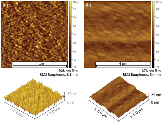 Comparative data are shown for two atomic force microscope (AFM) images obtained on a (a) 908 nm film and a (b) 373 nm film. A three-dimensional roughness display is shown below the images as a visualization of the difference in surface roughness between the two films. The scale on the roughness ranges from 0 nm to 39 nm, where the average thickness value is the center of the scale (18.5 nm). The variation generally falls within the ranges shown.
