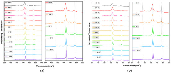 Figure 5 shows data from the powder samples. These data are temperature dependent and have endpoints of −193 °C and 400 °C resulting from the limits of the measurement system.# The corresponding data in Figure 5b for measurements performed with a reverse order of temperature steps, starting with the highest temperature, do not show any obvious hysteresis when compared with Figure 5a. This similarity and lack of hysteresis is best seen in Figure 6. For the datasets in Figure 6b–d, three vibrational modes are tracked, namely the Eg, A1g, and B2g modes, located at (for −193 °C) 476.6 cm−1, 636.5 cm−1, and 779.5 cm−1, respectively. Figure 5a,b shows a subset of peaks (for visual clarity) whose centers align with the three dashed vertical lines. These demarcations have been aligned with the coldest temperature data to provide a visualization for the amount by which a given peak shifts with temperature. These shifts, along with the formal assignment of the modes, are provided in Figure 6.