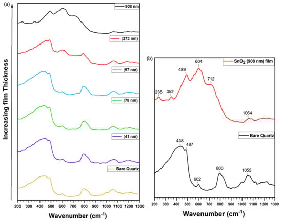 Though the SnO2 powder has provided us with ample information regarding the expected vibrational modes, it is still useful to obtain spectra of the various films to determine if there are any obvious signs of thickness dependence for those modes. As such, Figure 7 shows these data including the background spectrum for the bare quartz upon which the films reside. Raman spectra were collected for thicknesses of 908 nm, 373 nm, 97 nm, 78 nm, and 41 nm. Using the 908 nm film as an exemplary sample for the non-powdered samples, several of the modes were assigned and are indicated in Figure 7b. It shows a peak pattern change between bare quartz and 908 nm SnO2 film thickness. The bare quartz indicates a pronounced peak around 438 cm−1 due to Si-O-Si symmetric stretching [54,55]. Two peaks appeared at the 908 nm film at 238 cm−1 and 352 cm−1 that could be assigned to and A2g (optically inactive mode), respectively [56]. The peaks that are positioned at 487 cm−1 and 602 cm−1 in bare quartz and at 489 cm−1 and 604 cm−1 in the SnO2 film are associated with D1 and D2 defect modes of 4-fold and 3-fold rings in the normal 6-fold rings of SnO2 respectively 55, 57. The shoulder peak that appears on the SnO2 film at 712 cm−1 can be assigned to [56]. The 800 cm−1 peak that appears on bare quartz is associated with peak represented as ω3 band that coincides with Si motion against the tetrahedral O cage as symmetric bond stretching (O-Si-O) [55,56,57,58]. The following peaks at 1055 cm−1 in bare quartz and 1064 cm−1 in SnO2 film are associated with the symmetric stretching of Si-O [55].