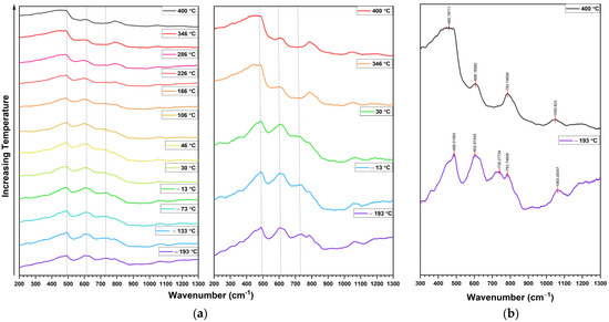 Powder samples were measured at experimental parameters listed in the Methods section. Powder was compressed into standard pellets prior to measurement and subsequently loaded into a cryogenic chamber with temperature control. (a) A series of Raman spectra are shown as a function of temperature, starting with −193 °C and ending at 400 °C with five spectra were plotted with greater vertical scaling to distinguish the changes apparent with some of the vibrational modes. (b) Measurements were generally repeated with temperatures decreasing from 400 °C to assess any hysteresis or other unaccounted effects.